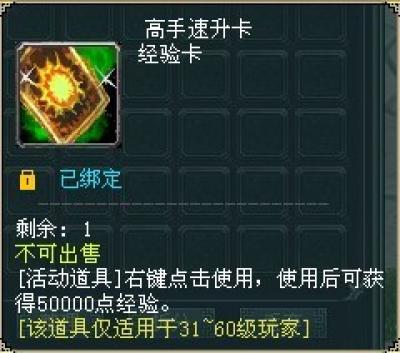 在5月20日至6月20日每天12:00~23:59。都可以得到一份超级大礼!15~60级的玩家都可以获得“活动经验丹”一枚!该经验丹有双倍经验效果!可以与双倍经验时间叠加!也就是说,在一个月里,你每天都能享受到四倍经验的快感!想升级?易如反掌!